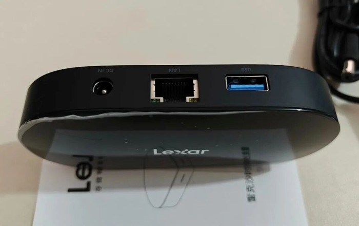 它背面只有USB 3.0、网线口和电源口,电源输入是12V/1A,但与传统NAS不同的是,它不是内置硬盘设计,而是用USB口外接移动硬盘(固态和机械都可以)。