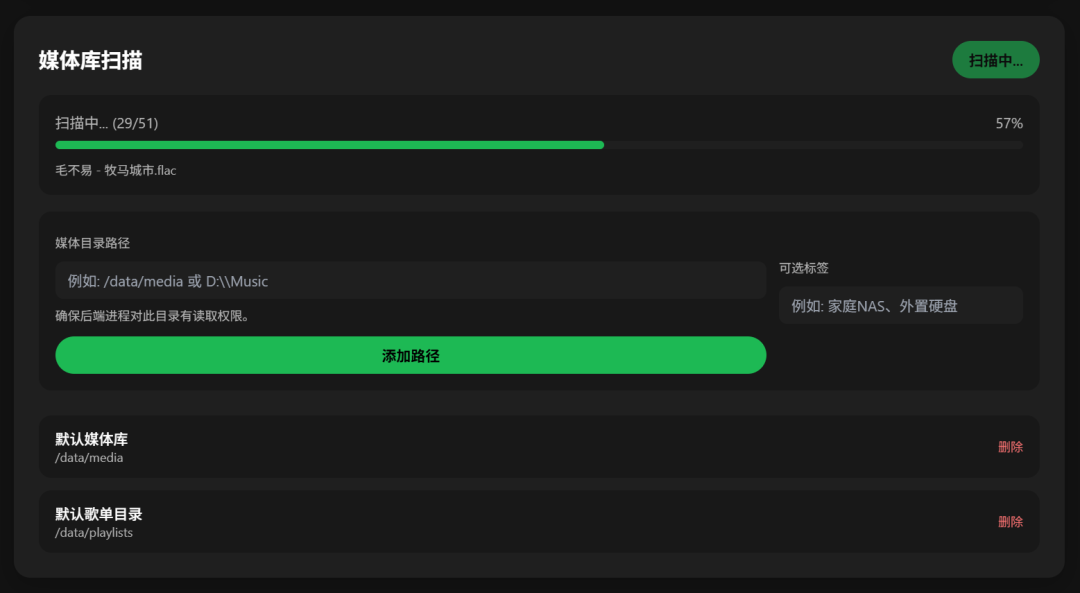 媒体扫描 :支持多目录配置,自动解析 ID3 元数据、封面、歌词并写入数据库。